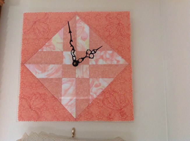 Since I had to take the clock down in my sewing room to change the time today, I decided to make the “Quilt in a Clock” kit that I purchased at Quilt Odyssey in July from Dianne Springer Designs. The kit included acrylic sheets cut for front and back, the clock and battery. I found a lonesome quilt block, quilted it and put the clock together. Now I can see a finished project and an enjoyable addition to my workspace!